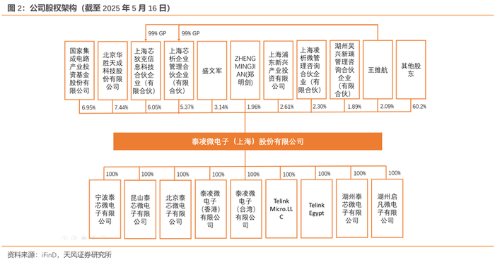 公司股权结构稳定。截至2025年5月16日,公司实际控制人王维航直接持股2.09%,通过上海芯狄克、上海芯析分别间接持股6.05%、5.37%。公司下设9家全资子公司,涵盖研发、设计、销售等业务环节,形成了完整的产业链布局。