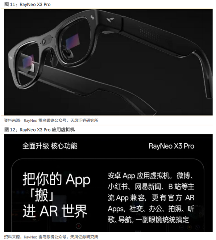 AI眼镜:雷鸟、Rokid、李未可等AI眼镜发布,看好AI眼镜融合部分手机场景功能,软硬技术成熟加持下渗透率持续提升。1) AR头部企业雷鸟正式发布双目全彩Micro-LED衍射光波导AR眼镜——雷鸟X3 Pro等产品。雷鸟X3 Pro搭载了骁龙AR1平台,还通过RayNeo AR虚拟机,实现了AR眼镜与安卓生态系统的深度结合。2)Rokid与高德地图战略合作,联合发布首个全场景智能眼镜导航应用。Rokid Glasses是一款双目衍射光波导AR眼镜,搭载了高通骁龙AR1芯片,集成AI多模态识别技术。3)AR眼镜市场热度持续回升,带动上游近眼显示项目的投资热度上升。多个国产企业在今年推动Micro OLED项目的落地与建设,进一步扩充国产Micro OLED的产能。4)5月25日,李未可科技推出了三款AI眼镜新品,分别定位不同用户群体的需求。李未可科技以「技术+数据+场景」优势构建壁垒。