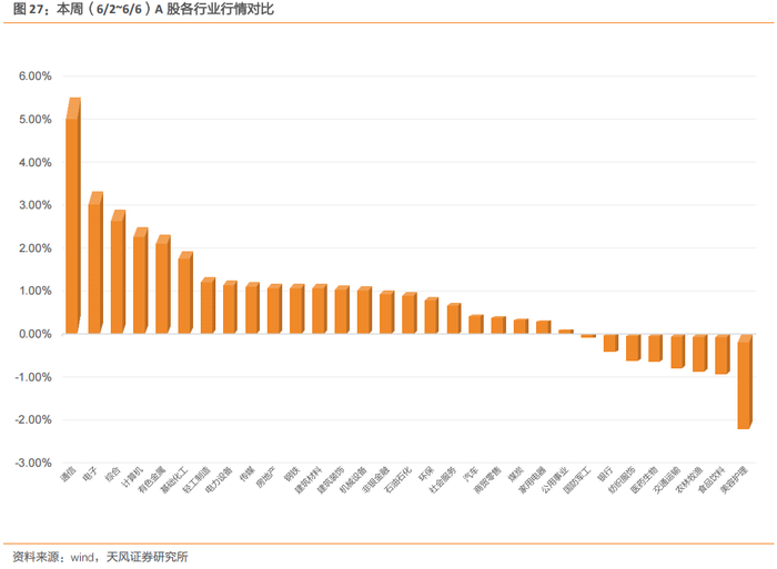 电子板块细分行业全部上涨。元件/其他电子/消费电子/电子/半导体/光学光电子/电子化学品本周涨幅分别为7.46%/4.43%/3.65%/3.60%/3.25%/2.33%/1.53%。