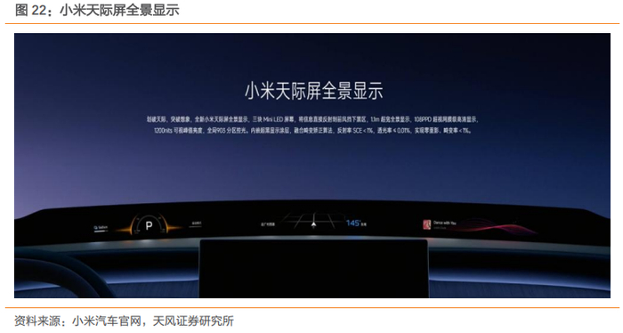华阳集团为小米YU7提供PHUD技术支持,开启智能座舱的新时代。小米YU7采用天际屏全景显示屏取代了物理仪表盘,该显示屏采用全景曲面投影技术,由三块Mini LED屏幕,将信息直接反射到前挡风玻璃下的黑色涂层区域,1.1m超宽的全景显示108PPD超视网膜级高清显示,1200尼特峰值亮度,全局903分区控光,内嵌超黑显示涂层,融合畸变矫正算法,反射率SCE<1%,透光率≤0.01%。