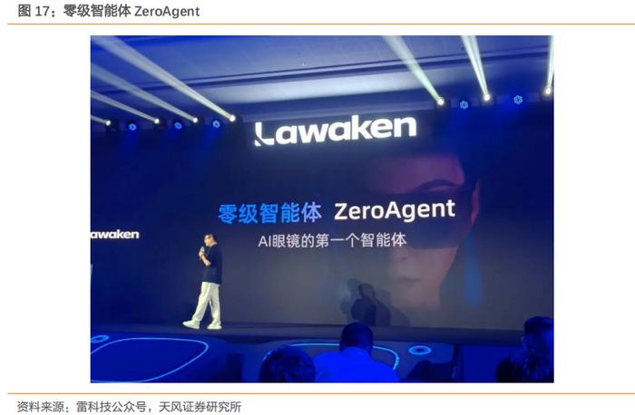 此外,李未可推出了号称 AI 眼镜的首个智能体——零级智能体 ZeroAgent。基于自研的WAKE-AI大模型与“零级智能体(ZeroAgent)”系统,新品实现三大突破:1)群体智能协作:李未可首创“智能体广场”生态,支持AI自主调用包括翻译、行程规划等多个功能型Agent,真正实现跨任务、跨场景的智能协同处理;2)自然交互革命:通过集成科大讯飞的定向降噪算法和阿里云通义大模型,ZeroAgent具备98%的高唤醒率,同时支持37种语言自动识别和无缝切换,大幅提升了语音交互的自然度和效率;3)场景生产力升级:联合米奥会展打造的“AI慧记”“AI慧写”等功能,能自动生成会议纪要和商务信函,极大提升跨国商务交流与信息处理效率,特别适用于多语种、高频沟通的会展场景。
