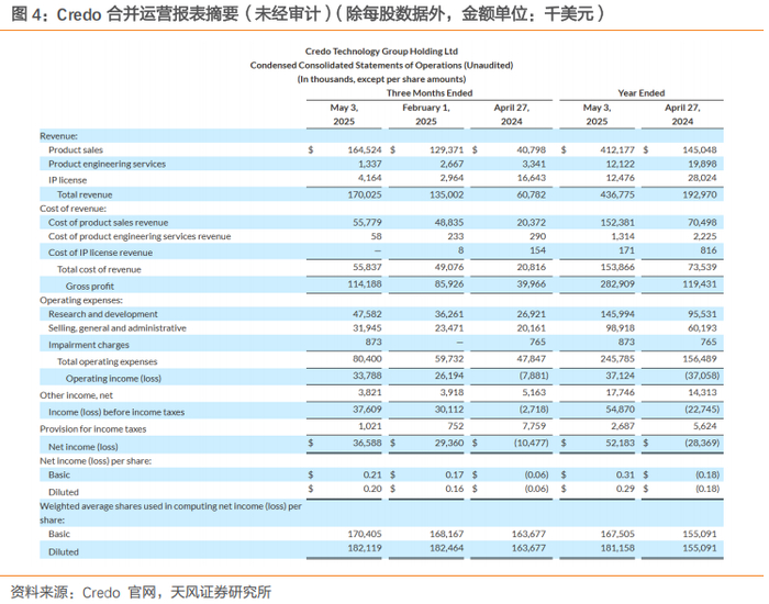 美国半导体与光学器件企业Credo Technology近日公布了截至2025年5月3日的2025财年第四季度及全年财务业绩,表现远超市场预期,带动公司股价连续上涨,受到高度关注。根据财报,Credo第四财季营收达1.70亿美元,环比增长25.9%,同比更是大幅增长179.7%;毛利率达67.2%,运营费用为8040万美元,净利润为3660万美元,摊薄后每股收益为0.20美元。截至2025年5月3日的2025财年第四季度及全年财务业绩报告期末,公司持有现金及短期投资余额为4.313亿美元,财务状况稳健。全年来看,Credo在2025财年的总营收为4.368亿美元,运营费用为2.46亿美元,实现营业利润3712万美元,净利润达5.22亿美元,摊薄后每股收益0.29美元。