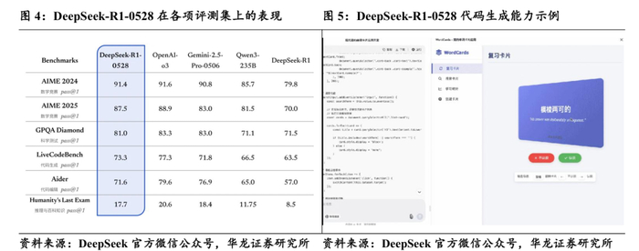 DeepSeek-R1小版本更新,推理能力再加强。2025年5月28日,DeepSeek发布了DeepSeek-R1-0528模型,是DeepSeek-R1的一次小版本升级,主要优化了模型的推理能力、幻觉问题和创意写作能力。本次更新的版本仍基于2024年12月发布的DeepSeek-V3-Base模型,但通过更强的后训练提升了思维深度和逻辑能力。推理能力方面:本次小版本更新后,DeepSeek-R1-0528在数学、编程、逻辑推理等任务上表现突出,国内领先,接近o3、Gemini-2.5-Pro等国际顶尖模型。在AIME2025测试中,准确率从70%提升至87.5%,思维链长度,即tokens使用量翻倍,在 AIME 2025 测试集上,平均每题使用 token量从旧版的12K tokens上升至23K tokens,意味着复杂问题思考时间将更长,思考深度提高。准确度方面:DeepSeek-R1-0528在幻觉问题上有明显改善,在改写、摘要、阅读理解等任务中,幻觉率降低45-50%,输出更可靠。文本写作方面:新版本模型的议论文、小说、散文等文体生成能力增强,能输出更长、结构更完整的内容,风格更贴近人类偏好。工具调用方面:支持工具调用,但不支持在“thinking”中调用工具。在Tau-Bench测试中,表现接近OpenAIo1-high,但仍落后于o3-High和Claude4Sonnet。我们认为,本次新版本模型推理能力大幅提升,尤其是数学和逻辑任务,幻觉率降低显著,增强了实用性,适合需要高准确率的场景,进一步巩固了国产大模型的竞争力。另外,新版本深度思考消耗的tokens相较旧版本显著提升,或持续提高推理端算力需求。