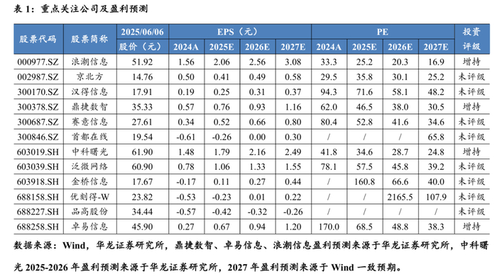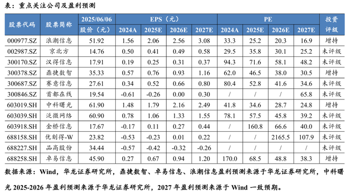 算力迎多重催化,产业协同趋势加强。催化一:海外映射下,算力产业链关注度上升。云计算方面:本年初至今,美股云计算公司COREWEAVE股价上涨250.4%;本月初至今上涨25.92%,表现出强劲的上涨动能。芯片方面:2025年6月5日,半导体厂商博通发布截至2025年5月4日的2025财年第二季度财报。该季度博通营收150.04亿美元,同比增长20%,略高于此前业绩指引149亿美元,略超市场预期,AI芯片需求指引依旧向好。催化二:海光信息拟吸收合并中科曙光,国产算力产业链协同优势逐步凸显。根据2025年5月26日海光信息公告,海光信息拟吸收合并中科曙光。海光信息所处赛道为算力上游芯片环节,主要收入来源为CPU和DCU;中科曙光以高端计算设备起家,目前主要收入来源为服务器、云基础设施,参控股海光信息、曙光数创(算力产业链液冷龙头)等多项优质资产。合并完成后,海光信息与中科曙光将完成从芯到云的全产业链补全,国产算力协同趋势进一步加强。另外,2025年6月4日,国内云计算厂商青云科技与海光信息签订战略合作协议,双方将依托青云云平台、AI 智算平台与海光芯片的各自优势,展开合作。我们认为,海光信息拟吸收中科曙光、青云科技与海光信息合作共同强化了国产算力从芯到云产业链协同的趋势,这种软硬件一体化优化有利于打破传统国产算力领域“单点突破”的局限,可显著提升国产算力基础设施的性能与稳定性,缩小与国际领先技术的差距。催化三:算力服务厂商近期持续公告业务进展,下游高景气度有望持续验证。2025年5月,宏景科技、平治信息、协创数据陆续公告算力服务业务进展。我们认为,当前国内算力需求仍处于高速扩张阶段,近期算力租赁行业密集披露的大额订单及采购计划集中反映了产业的高景气度,随着Deepseek等国产模型厂商技术迭代,模型及应用层对算力需求的拉动作用将更为明显,行业拐点正在显现。