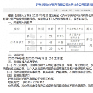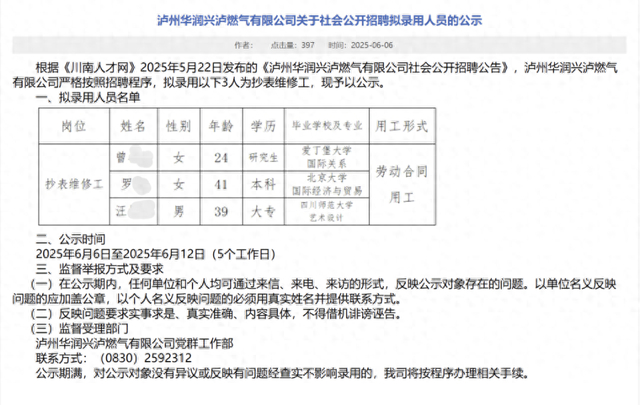 6月9日,一张来自泸州华润兴泸燃气有限公司(以下简称“华润兴泸燃气公司”)的拟录用公示引发大家关注。引发讨论的是,在这份2025年拟录用抄表维修工人员的公示名单里,拟录用的3人中,仅有1人是大专学历,其余2人,1人是爱丁堡大学国际关系研究生;另1人则是北京大学国际经济与贸易本科生。