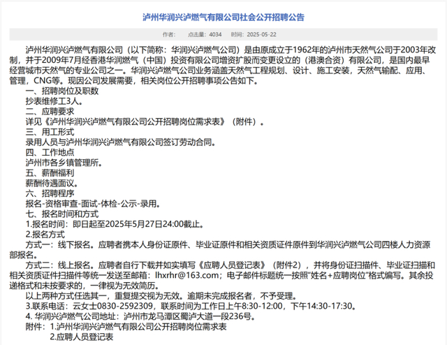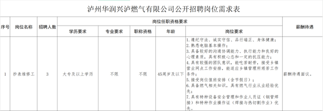 记者注意到,在该公司此前5月22日发布的社会公开招聘公告里明确,本轮招聘涉及抄表维修工1个岗位,共需要招聘3人。其学历要求大专及以上,年龄在45周岁及以下,专业不限,职称不限。录用人员将与华润兴泸燃气公司签订劳动合同,工作地点在泸州各乡镇管理所。
