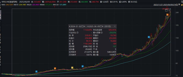 王宁家族身家暴涨的原因并不复杂,在过去一年多时间中,泡泡玛特股价持续暴涨,2024年以来,其股价暴涨超11倍。若以其间最低价和最高价计算,股价最高涨幅超过1400%。