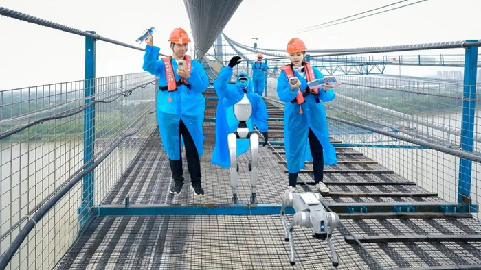 6月8日,一个国产人形机器人和2只机器狗登上燕矶长江大桥184米的高塔,挑战通过3公里长的猫道。猫道是柔性非铺装路面,高空强风会导致猫道晃动。机器人步伐轻盈,经过改进控制算法,在通过猫道的过程中表现出了惊人的稳健。