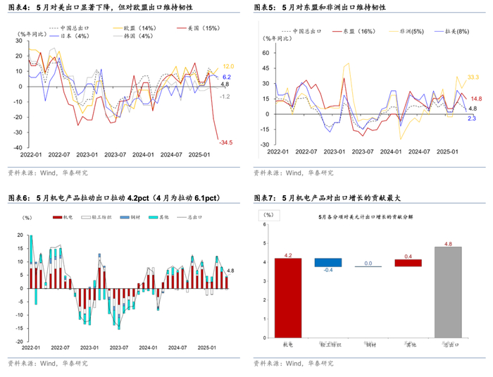 对美出口回落、东盟及欧盟出口维持高增:5月对美出口同比从4月的-21%进一步回落至-34.5%,对5月出口增速的拖累从4月的3.2个百分点走阔至5个百分点;对拉美出口增速亦从4月的17.3%明显回落至2.3%,而对东盟/欧盟/非洲出口同比保持两位数增长,对5月出口增速的提振分别约为1.8/2.5/1.6个百分点。