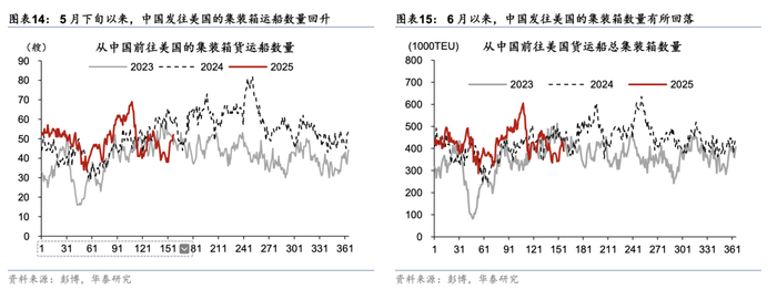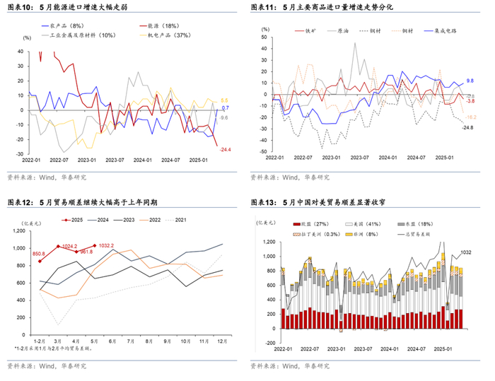 集成电路出口增速继续上行,汽车及配件出口亦维持较强韧性,但劳动密集型产业(箱包、家具等)出口增速仍偏弱,可能显示本轮关税降级后的“抢出口”反弹较为有限。机电产品5月同比增速较4月的10.5%继续放缓至7.2%,而劳动密集型产品中服装同比增速较4月的-0.5%略反弹至2.5%,鞋靴、箱包等出口降幅仍有走阔。