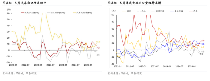 分产品看,在中美关税降级超预期的影响下,机电中间品和资本品出口显著强于消费品:5月机电产品出口维持韧性,其中集成电路出口维持高增;汽车出口增速回升;轻工纺织等劳动密集型产品出口同比增速继续下滑;钢材仍呈现“以价换量”的特征。具体看: