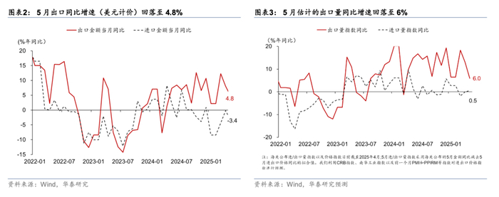 海关总署公布的数据显示,2025年5月美元计价出口同比增速从4月的8.1%回落至4.8%(彭博一致预期为6%);进口同比增速则从4月的-0.2%继续回落至-3.4%(彭博一致预期为-0.8%);贸易顺差上行至1032亿美元、同比多增219亿美元,净出口仍对5月名义增长形成支撑;我们预测5月以美元计价的出口价格指数同比降幅较4月的3.3%收窄至1.1%,以此推测出口量增速从4月的11.8%走弱至6%左右(图表3)。