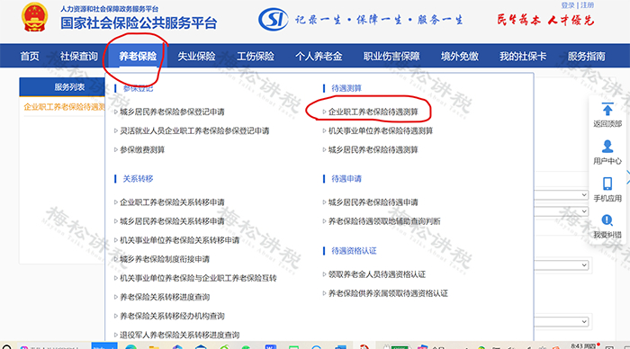 养老金测算:第一步:登录“国家社会保险公共服务平台”,找到“养老保险-企业职工养老保险待遇测算”。