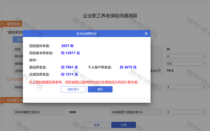 (注:这个计算器,只是根据我们的假设数据,推算出最终退休金。实际情况,可能和我们推算的会有差别,因此,只能做个参考,大致了解一下。举例仅供参考,每个人的养老金根据当地工资水平、缴费年限、缴费档次的不同,而不一样。)