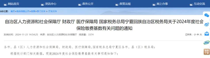 宁夏回族自治区人力资源和社会保障厅发布《关于2024年度社会保险缴费基数有关问题的通知》。