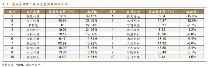 在基础化工板块424只股票中,本周347只股票上涨,66只股票下跌,11只股票持平。本周个股涨幅前十名分别为:联化科技(+39.1%)、领湃科技(+29%)、中毅达(+22.5%)、苏利股份(+21.6%)、唯科科技(+19.9%)、永悦科技(+19.8%)、联合化学(+15.9%)、润阳科技(+15.5%)、永太科技(+15.2%)、奥克股份(+14.8%)。本周个股跌幅前十名分别为:恒天海龙(-15.9%)、苏州龙杰(-12.6%)、万朗磁塑(-8.7%)、宿迁联盛(-8.3%)、高盟新材(-6.8%)、赛特新材(-6.4%)、长鸿高科(-6%)、亚香股份(-5.4%)、新瀚新材(-5.1%)、沧州明珠(-4.5%)。