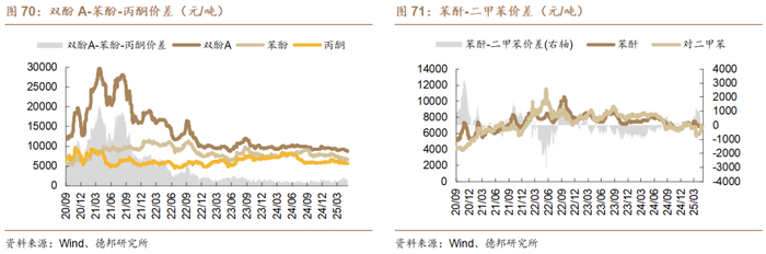 本周化工品价差涨幅前十名为:PET半光-PTA-MEG价差(+113元/吨)、PET有光-PTA-MEG价差(+108元/吨)、三聚磷酸钠-黄磷-纯碱价差(+59元/吨)、己内酰胺氨肟化法价差(+358元/吨)、复合肥价差(+13元/吨)、六偏磷酸钠-磷酸-纯碱价差(+123元/吨)、磷酸氢钙-磷矿石-硫酸价差(+63元/吨)、炭黑-煤焦油价差(+179元/吨)、涤纶短纤-PTA-乙二醇价差(+113元/吨)、三聚氰胺-尿素价差(+40元/吨)。
