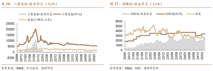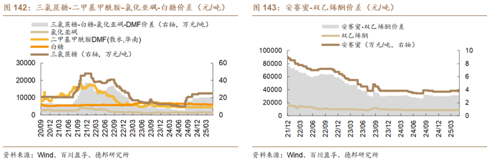 氯虫苯甲酰胺:供给遭遇不可抗力,产品涨价有望延续。供给:氯虫苯甲酰胺是全球第一大杀虫剂,根据百川盈孚,截止2024年底,氯虫苯甲酰胺国内产能合计约2.72万吨/年,其中包括山东友道(11000吨)、利尔化学(5000吨)、内蒙古圣灵(3000吨)、内蒙古中高(3000吨)、重庆华歌(2000吨),辉隆农资(2000吨)、山西绿海(1200吨)。行业CR3占比约69.9%,集中度较高。其中龙头为山东友道(产能1.1万吨,占比为40.4%),近期其由于不可抗力,氯虫苯甲酰胺供给或将偏紧。新建产能方面看,虽然我国规划大量产能,但由于原材料K胺存在专利保护及与康宽价格下跌影响,规划产能建设进度缓慢,短期不影响氯虫苯甲酰胺供应。需求:根据世界农化网,2023年氯虫苯甲酰胺主要应用市场包括巴西(约占36%)、印度(约占20%)、美国(约占12%)、中国(10%)、阿根廷(4.6%),当前正值东南亚市场需求旺季,南美市场也将逐步开启,氯虫苯甲酰胺海外需求良好;长期看由于氯虫苯甲酰胺产品效果较优,随着垄断解除,市场需求近年逐步上行。价格:根据百川盈孚,在专利到期后,氯虫苯甲酰胺报价从2023年的43万元/吨下跌至目前22.5万元/吨,近两年历史分位为8.9%,处于历史底部区间。我们预计由于本次行业的不可抗力,氯虫苯甲酰胺有望迎来涨价。建议关注:①氯虫苯甲酰胺:利尔化学、红太阳、辉隆股份;②K胺(氯虫苯甲酰胺核心原料,合成过程三废成本高、危险性高):联化科技、广康生化;③3-甲基-2-氨基苯甲酸(K胺制备过程重要中间产物,生产难度高、危险性高):贝斯美。