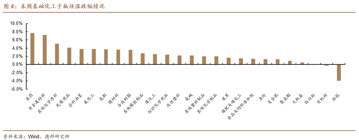细分板块看,在基础化工26个子板块中,24个子板块上涨,2个子板块下跌。本周子板块涨跌幅前五名分别为:农药(+7.7%)、非金属材料(+7.2%)、其他化学原料(+5%)、民爆用品(+4.1%)、涂料油墨(+3.8%);本周子板块涨跌幅后五名分别为:粘胶(-3.9%)、有机硅(-0.2%)、钛白粉(+0%)、无机盐(+0.5%)、聚氨酯(+0.9%)。