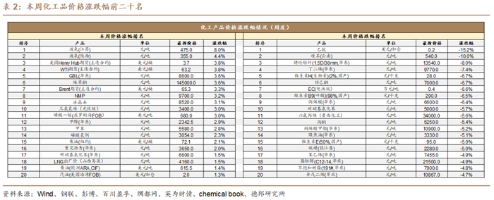 本周化工品价格跌幅前十名为:乙烷(-15.2%)、硅石(云南)(-10%)、腈纶短纤(1.5D/38mm,华东)(-8%)、丁二烯(华东)(-7.4%)、维生素H(生物素)(2%,国产)(-6.7%)、环己酮(-6.7%)、EC(电池级)(-6.6%)、维生素B9(叶酸)(98%,国产)(-6.5%)、丙烯酸(华东)(-6.4%)、对硝基氯化苯(-5.7%)。