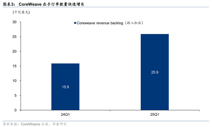 2)北美算力租赁厂商订单加速增长,反映出大模型厂商对未来算力需求的乐观态度。CoreWeave作为北美最大的算力租赁厂商之一,3月底在纳斯达克上市,自上市以来涨幅接近260%,反映了美股资本市场对算力端的信心。2025年3月,公司与OpenAI签署5年119亿美元的合同;2025年5月,公司与OpenAI再签40亿美元拓展协议,期限至2029年;根据公司25Q1电话会,截至25Q1,公司收入积压为259亿美元,同比增长63%。从CoreWeave订单快速增长来看,高端GPU需求仍存在强劲的增长动能,证明了全球算力需求高景气度仍然存在,我们持续看好AI算力需求。
