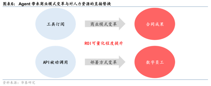 我们还观察到AI应用目前进入新的发展阶段,具体体现在商业模式变革与对人力资源的直接替换。1)从“工具订阅”到“成果合同”,特征表现为企业不再为功能付费,而是为可量化 KPI 或直接收益买单,SaaS 的“按座位收费”逻辑被快速侵蚀,销售、营销、风控等预算正迁移到“结果共享”或“按增收分成”的新合同里。2)“被调用”到“主动调度”的智能体操作系统,特征:AI不再只是API,而是能自我触发、持续运行的数字劳动力,自主工作能力提升给企业带来切实效益,企业开始像部署人力资源一样部署 AI 资源,运营中心出现“智能体排班表”,人力成本与AI计算成本出现此消彼长的新结构。