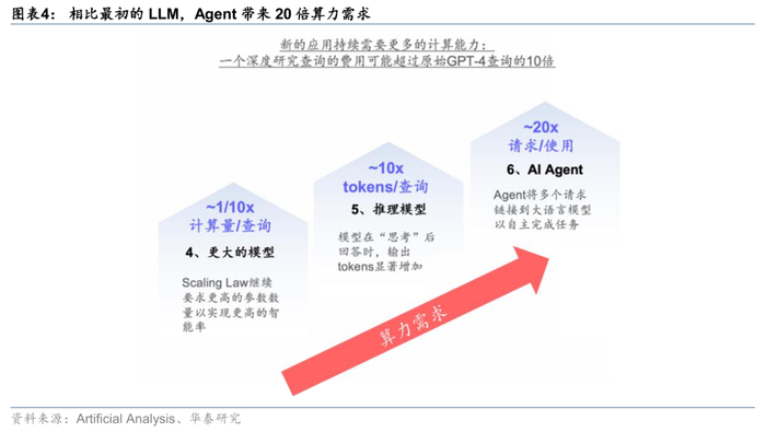 Agent需求的爆发或将驱动推理算力实现数十倍乃至上百倍的增长。据Artificial Analysis统计,在模型扩展律(Scaling Law)主导的初期阶段,增大模型参数是主要方向,这带来了约5倍的算力提升。进入模型后训练与推理为主导的阶段后,模型输出的Token数量显著增加,推动算力需求再增长约10倍。而步入Agent时代,算力需求激增的驱动力转变为单Agent处理单任务所需的请求次数(request),这一数量级预计提升约20倍。鉴于Agent几乎完全由推理模型驱动,这些因素叠加(参数增大×Token增长×请求量剧增)最终将导致整体推理算力需求呈现数十倍甚至上百倍的跃升。