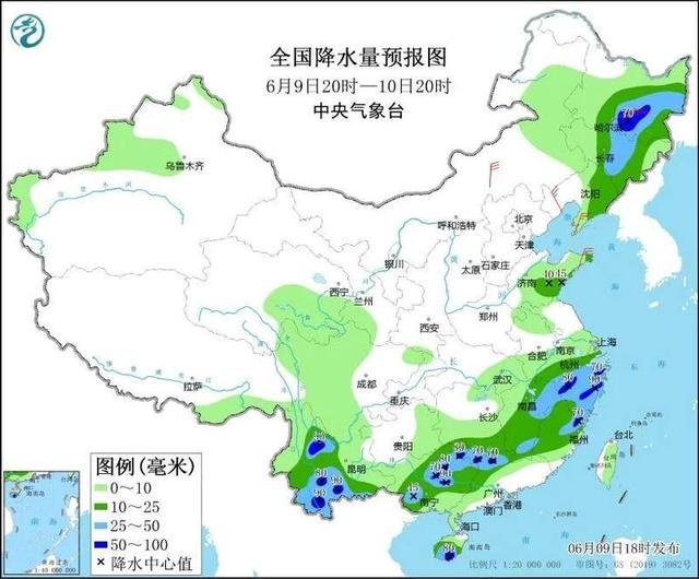 黑龙江中东部、吉林中部、山东中南部、云南中西部、江南中东部和西南部、华南西部、海南岛等地的部分地区有大雨,局地有暴雨。