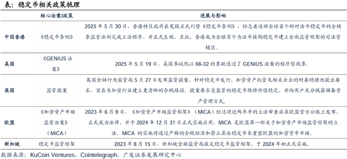 稳定币监管体系逐渐完善。全球稳定币监管力度不断加强,机构化与合规化趋势凸显,中国香港和美国走在全球前列。香港《稳定币条例》是全球首个针对法币稳定币的全链条监管法例,已于2025年5月30日正式生效,旨在巩固国际金融中心地位并探索离岸人民币应用。美国《GENIUS法案》要求稳定币100%储备(美元、短期美债等)、实施分级监管并强调透明度与合规,其核心目的是维护美元主权地位并防范金融风险。欧盟、新加坡等都有关于稳定币的条款,对稳定币的发行、流通、信息披露等制定了一系列的监管框架,但目前整体还在初期阶段。随着各国政府和监管机构对数字货币市场的关注度提高,越来越多的国家开始制定和发布针对稳定币的监管政策。这些政策为稳定币的合法性和合规性提供了保障,有望进一步推动市场健康发展。
