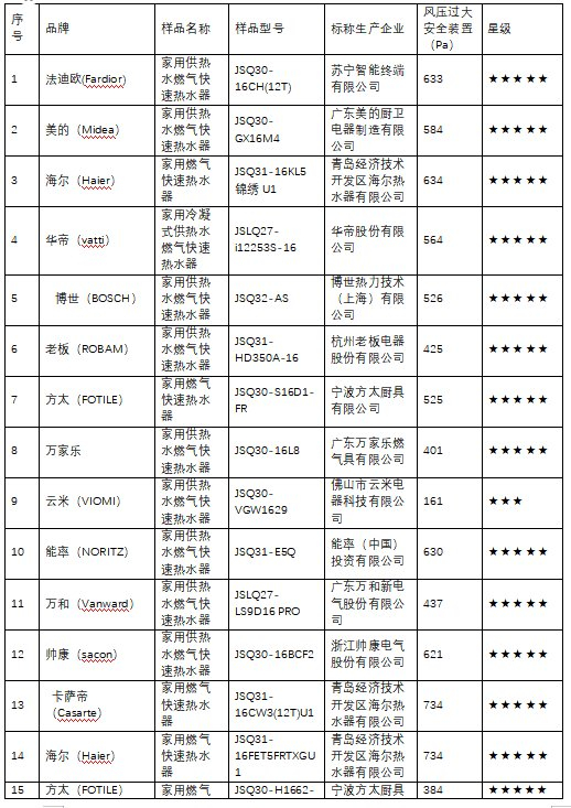 3. 风压过大安全装置:所有样品均能满足国家标准要求,其中海尔JSQ31-16FET5FRTXGU1、卡萨帝JSQ31-16CW3(12T)U1 2款样品,风压动作值达到了700Pa以上。