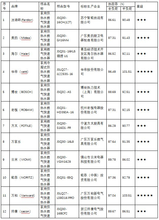 1.热效率:本次比较试验样品热效率均能达到样品能效标识标称的等级。其中2款标称1级能效的冷凝式燃气热水器,为华帝JSLQ27-i12253S-16和万和JSLQ27-LS9D16 PRO,其余18款均达到2级能效。