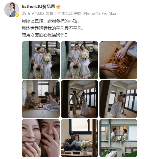6月9日,女演员刘品言官宣怀孕结婚:“谢谢连晨翔,谢谢我们的小孩,谢谢世界赠与我的平凡与不平凡,请用守护的心祝福我们吧。”