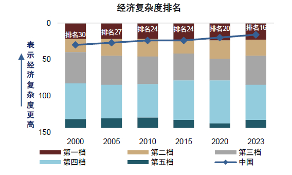 除了经济结构改善,技术进步也在提速,尤其是非传统行业内部。根据哈佛大学的一项研究[4],中国经济复杂程度稳步上升。拥有大量多样化生产技术,尤其是复杂专业技术的国家,能够生产出种类繁多的精密产品,经济复杂度也就更高。2020年中国已经迈入经济复杂程度最高一档,2023年在全球排名第16,与美国排名的差距愈来愈小。