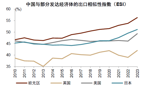 美联储的一项研究用中国与发达经济体的出口相似性指数来衡量中国制造业的竞争力。2010-2023年,中国与欧日出口相似性指数趋势性上升,与欧元区的出口相似性指数上升更快。分产品看,机械和运输设备和化学成品及有关产品的出口相似性指数上升较多。中国进口产品与日欧出口产品之间的相似性加速下降,这意味着中国国产化在提速。