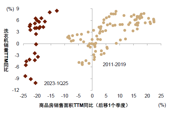 房地产调整对中国经济的拖累逐步收窄。美国上一轮金融周期下半场大概率持续了6年左右,中国金融周期大致于2018年左右见顶,其下行速度已经放缓。我们的估算表明,房地产对中国经济增速的贡献在2021年下半年转负,其中2022年的拖累最大,近几个季度则逐步收窄(图表1)。微观层面,部分家电销量与房地产销量之间的相关性也由强转弱。比如,2011-2019年期间,洗衣机销量同比与商品房销售面积同比呈现清晰的正相关关系,但近年来,二者之间的相关性显著下降(图表2)。这是因为,当下洗衣机的销售更多反映更新换代或者置换性需求,而早年间更多是购房后的新家配置需求。