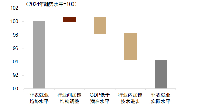 我们以2024年中国非农就业为例分析总需求变化、结构变化以及技术进步分别对就业产生的影响。我们测算了潜在经济增速、技术进步和产业结构调整的历史趋势所对应的趋势就业水平,并将这个潜在水平与实际的非农就业水平进行比较。我们发现行业内技术进步加速和需求缺口都造成了就业放缓。如果以2018年的劳动密集度为100,2024年中国第二和第三产业劳动密集度大约位于70-80之间。我们估算的结构变化对就业影响为正,可能反映某些占比提升的服务业对就业的吸纳能力,比如平台经济对就业的“蓄水池”作用,尤其是灵活就业。2021年以来行业结构的加速调整,导致金融、房地产、建筑业的就业需求低于2020年前的趋势水平,但工业以及其他服务业(不含房地产、金融)的就业需求高于2020年前的趋势。