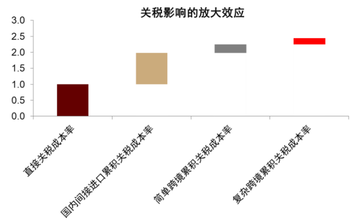 注:测算的是全球产品平均结果。国内间接进口累计关税成本率表示国内产业链内部中间产品的多阶段传导过程中所承载的关税成本。简单跨境累计关税成本率指经由一次跨境交易所产生的关税传导效应。复杂跨境累计关税成本率是指至少经过两个以上阶段和一次以上跨境交易的生产路径中,进口关税的累积传导。图中呈现的是比例,假设直接关税成本率为1,那么复杂跨境累积关税成本率可能为2.4.