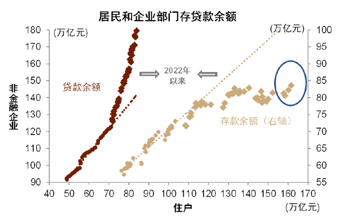我们接下来展望“三驾马车”的走势。由于居民存款、理财、保险资产等低风险资产持续增长,加上房价对居民资产的负面拖累收窄,今年一季度城镇居民净资产增量由负转正。与此同时,我们也观察到居民消费意愿边际提升。我们的研究显示,2022年之后,非金融企业贷款增速快于居民,反映居民借贷动机弱于企业。但从存款端来看,居民存款增速快于企业,这说明居民消费意愿偏弱。这背后的逻辑可能是企业贷款后发放工资,但居民拿到工资后没有急于消费而是以存款方式储值。如果居民拿到工资后用于消费,那么企业存款会增加。但现实情况是居民贷款增速慢于企业,而其存款增速快于企业,反映居民消费意愿偏弱,储值意愿偏强。不过,我们观察到最近2个月企业存款增速快于居民,反映居民消费意愿或有提升。