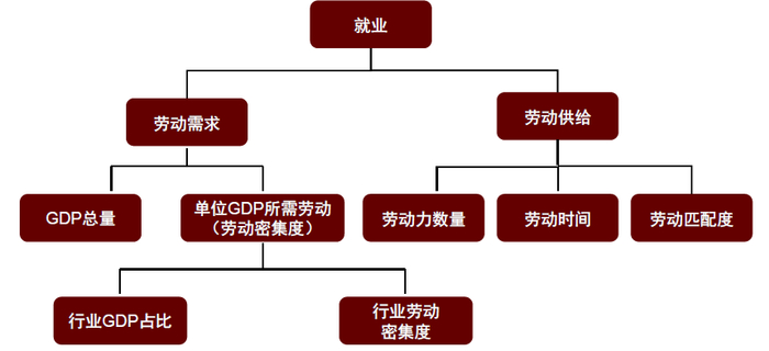 劳动市场的演变会直接影响居民就业和收入,进而影响消费与物价,接下来我们讨论结构改善和技术进步对劳动市场的影响。劳动需求取决于经济总量和劳动密集度,而总体的劳动密集度又取决于各行业在经济中的权重以及各行业本身的劳动密集度。劳动供给主要取决于劳动力数量、劳动时间和劳动匹配度。一般而言,经济结构变化将导致劳动匹配度下降,但劳动时间上升会缓解错配对供给的影响,也会缓冲劳动力数量下降对供给的影响。