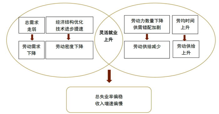 如前所述,消费演变还取决于劳动市场的变化。前面的分析结果显示,经济结构变化与技术进步导致劳动密度下降(资本深化提速)。需求缺口尚未收敛,劳动供给时数未见下降,其中有灵活就业的贡献。综合劳动供需,失业率没有大幅变化,但收入增速偏缓。