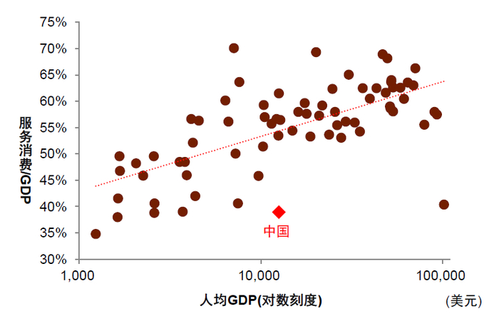 图表18:服务消费与国际拟合线差距相对较大
