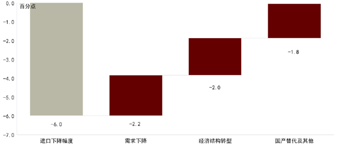 注:需求下降的贡献基于使用进口与社零、固定资产投资和出口的历史回归关系推算得出,经济结构转型的影响基于原材料的进口占比下降推算,其余为国产替代及其他因素