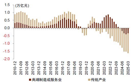 注:筹资净现金流的行业划分为申万一级行业。高端产业包括电子、汽车、家用电器、医药生物、电力设备、机械设备、国防军工、计算机、通信、美容护理等10个行业。传统产业包括农林牧渔、基础化工、钢铁、有色金属、食品饮料、纺织服饰、轻工制造、公用事业、交通运输、房地产、商贸零售、社会服务、综合、建筑材料、建筑装饰、传媒、煤炭、石油石化、环保等19个产业