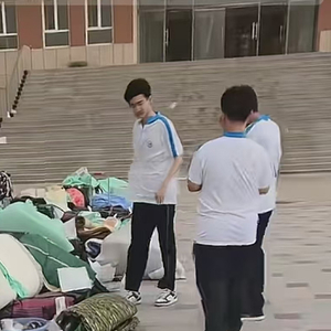 视频显示,学校内一片空地上摆放着大量学生行李,起风时,不少学习资料被风吹起。有学生正在整理铺盖,铺盖部分区域被淋湿,周围散落着不少黑色塑料袋。