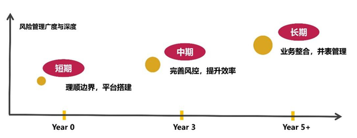 短期内,在“标准化”阶段打破母子公司间的“文化孤岛”与“数据孤岛”,通过建立统一的风险管理语言与流程,形成统一的风险管理文化;通过制定集团统一的风险数据报送规范,明确核心字段的定义与计算逻辑,避免母子公司间的口径差异;逐步通过系统接口替代手工台账方式,减少人工误差。