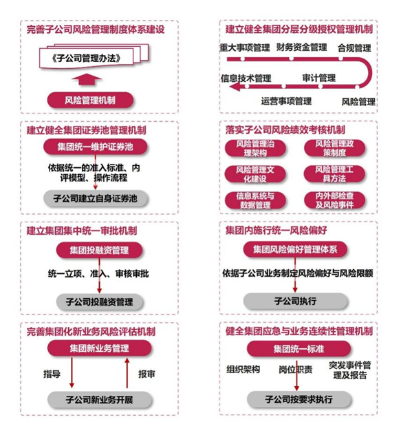《并表管理指引》以“穿透式+全景式”风控体系为核心,强调通过数据整合和统一的识别与评估机制来实现风险的全链条管控。我们认为其核心意图在于打破子公司与母公司的信息孤岛,通过垂直一体化管理防止风险在体系内的无序传递。例如,《并表管理指引》要求“证券公司统筹制定风险偏好,建立覆盖各附属机构的风险管理制度及风险限额体系,在并表管理体系范围推行基本一致的风险偏好和管理流程,并对风险限额实施逐级有效分解”,本质上是为了解决“看得见的风险”与“看不见的风险”之间的鸿沟,通过构建“风险一致性”的文化逻辑,要求子公司与母公司形成统一的风险识别和应对标准。