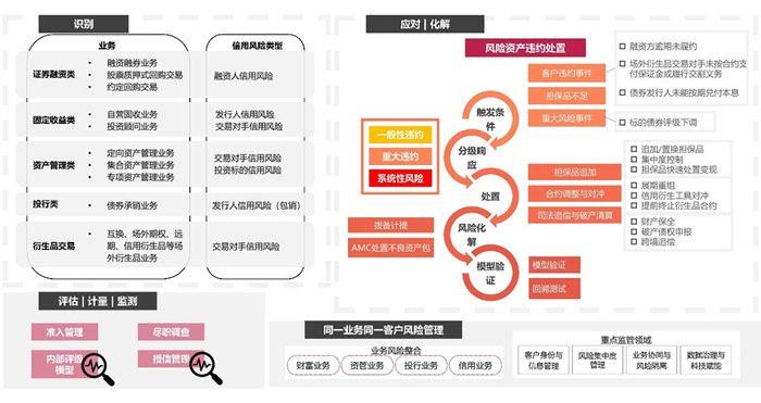 针对信用风险管理,建议证券公司积极搭建预期信用损失模型来计量预期信用损失,包括针对融资融券客户信用违约概率、违约损失率的计量模型,以及针对违约标的证券质量与担保品价值的估值模型;积极融合企业注册资本、行业地位、财务健康度等定量指标,以及标的证券流动性、估值合理性等定性要素进行内部评级体系的搭建,并围绕同一客户,同一业务框架建立集团化统一授信体系,科学动态地设定与监测客户/行业的授信集中度限额。