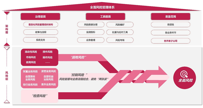 天职国际基于证券行业风险管理体系建设实践,认为证券公司应当围绕核心专项风险领域实施交织业务属性的穿透式交互管理,具体如下:
