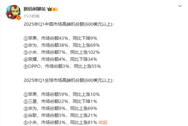 最新行业数据显示,2025年第一季度,中国高端手机市场格局发生巨变,苹果市场份额同比下降9%至43%,而华为与小米两大国产手机厂商分别以38%和7%的份额紧随其后,同比增长69%和102%。