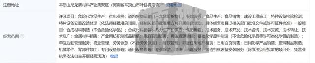 记者搜索发现,中国平煤神马集团尼龙科技有限公司位于河南省平顶山市叶县龚店乡常李村,是中国平煤神马集团全资子公司,位于河南省平顶山市尼龙新材料产业集聚区内,是集聚区龙头企业和“中国尼龙城”建设的核心企业。经营范围包含:危险化学品生产、供电业务、道路货物运输(不含危险货物)、餐饮服务、食品生产、特种设备检验检测等。